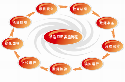 卓渝ERP系统实施的过程:项目规划、教育培训、数据准备、流程设计、模拟运行、数据检验、上线运行、优化调整、项目结案、后期常规优化等。